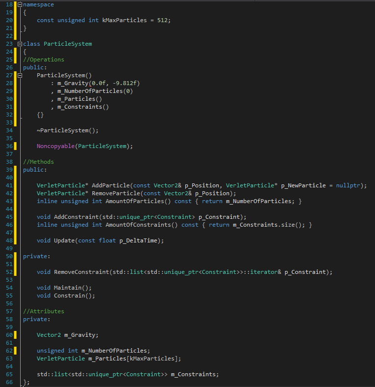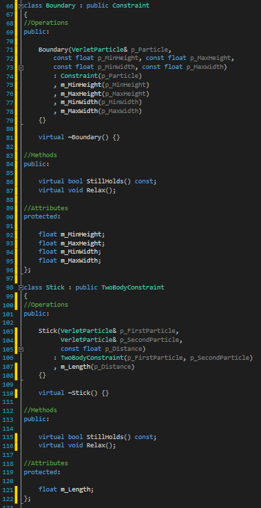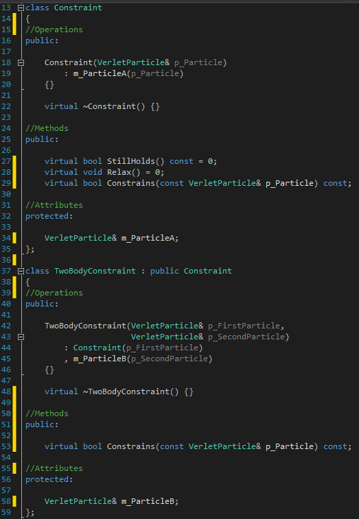 The abstraction of constraints proceeds with the most simple and then a two-body constraint. As in [Jakobsen] and [Counts], you could even have a three-body constraint that provides angular stiffness. I believe this is a great use of abstraction; base class pointers paired with interfaces that guarantee behavior. I figured every constraint needs to be relaxed, which means doing something to the particles so that the constraint is satisfied. Moreover, Boolean checks for whether a constraint still can or needs to be satisfied is necessary for keeping the simulation in a consistent state [Counts]. The ability to check if a certain particle is constrained is very useful for interaction with the particle system in UI or gameplay elements.