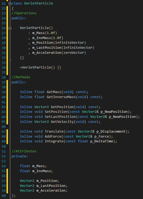 First off, you create your particle class. I chose to go with a rigorously object-oriented (OO) VerletParticle class but it may be optimal to use arrays for position, previous position and acceleration vectors and iterate over those, as in [Jakobsen]. Regardless of how it's done, the basic idea is that you iterate over some array while performing the Verlet numerical integration method.