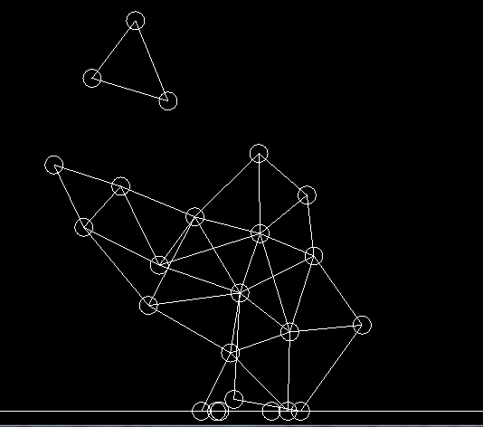 Lastly, we need to get the simulation to run. A couple constraints are needed just to get the particles working in a familiar way. A boundary is needed to keep the particles on screen; this is similar to the C1 iteration of [Jakobsen]. Next we need something to hold the particles ("balls") together. For this, I used a class that functions similarly to the C2 iteration of [Jakobsen] and the Link class in [Counts].
